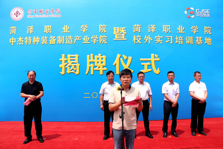 Kong Lumin, Deputy Director of the Luxi New Area Management Committee and Director of the Cultural and Health Service Center, stated in his speech that in recent years, the Luxi New Area has adhered to innovation-driven development, vigorously implemented the strategy of revitalizing the area through science and technology, and positioned technological innovation as a key pillar for accelerating the transformation of old and new growth drivers, as well as a crucial measure for shifting economic development models. The unveiling of the "Zhongjie Special Equipment Industry College of Heze Vocational College" and the "Heze Vocational College Off-Campus Internship and Training Base" marks a significant milestone in the integration of industry and education in the Luxi New Area. The strong collaboration between Heze Vocational College and Shandong Zhongjie Special Equipment Co., Ltd. will undoubtedly elevate the synergy of industry-education integration and collaborative innovation to a new level. It is hoped that both parties will seize this opportunity of the unveiling ceremony to further deepen cooperation and exchanges in academics, scientific research, management, and talent cultivation. By leveraging the industry college and training base as platforms, they will expand and strengthen their efforts, attract and cultivate more talent, and make greater contributions to the high-quality development of the Luxi New Area!